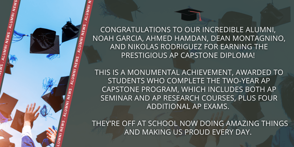 Congratulations to our incredible alumni Noah Garcia, Ahmed Hamdan, Dean Montagnino and Nikolas Rodriguez for earning the prestigious AP Capstone Diploma! This is a monumental achievement, awarded to students who complete the two-year AP Capstone program, which includes both AP Seminar and AP Research courses, plus four additional AP exams.