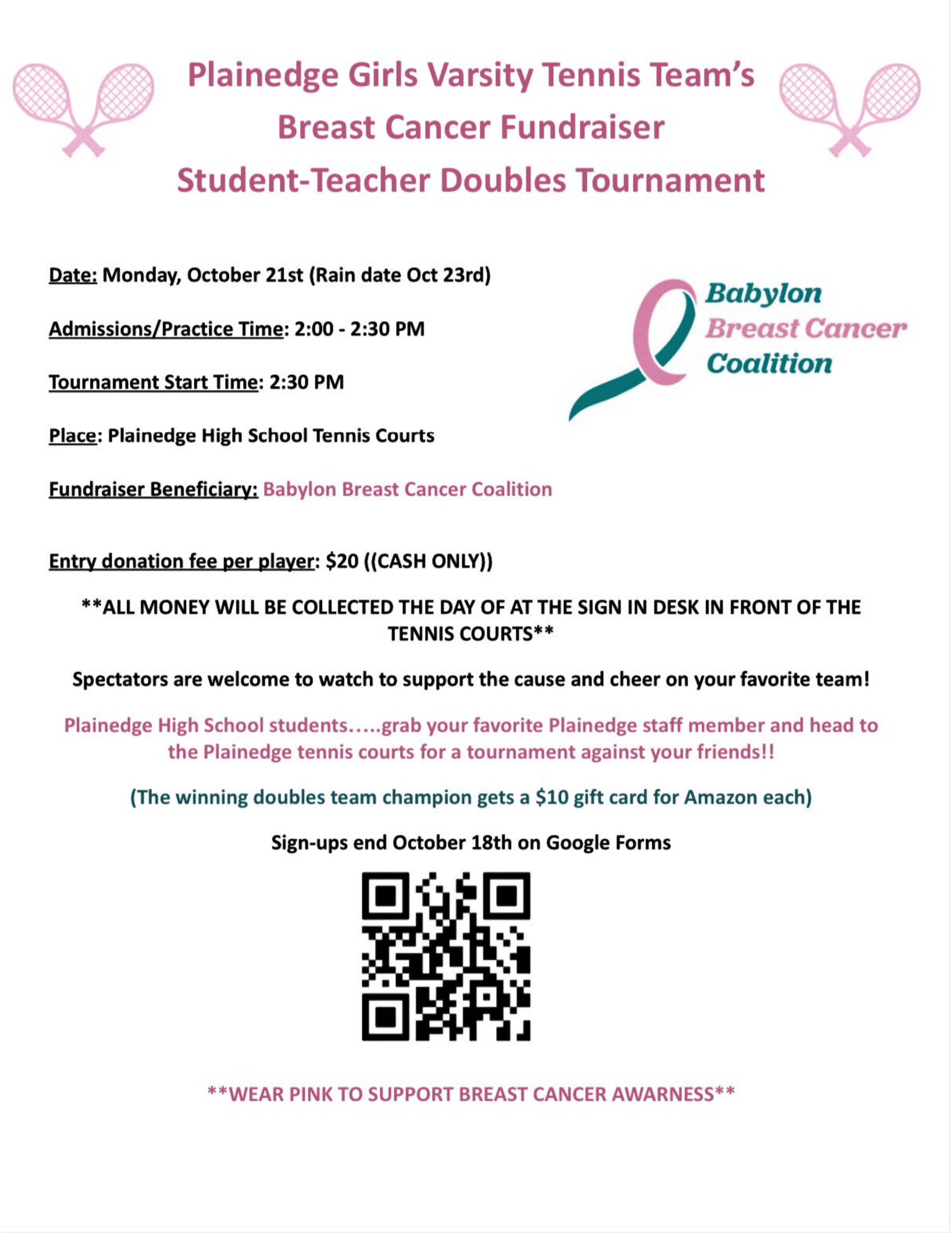 Members of the PHS tennis team have organized a student-teacher doubles tennis tournament to benefit the Babylon Breast Cancer Coalition. See the attached flyer for more information and sign up at the link provided: https://docs.google.com/forms/d/e/1FAIpQLSfBzlGwmByi1BpvH2Ip6yuAtdCSCUopa9fjCDProWeHxsJ2gQ/viewform