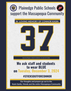 In loving memory of Connor Kasin, we stand together as a community. 💙 On Tuesday, December 3rd, we ask all staff and students of Plainedge Public Schools to wear BLUE in support of the Kasin family, their friends, and the entire Massapequa Community. #STICKSOUTFORCONNOR
