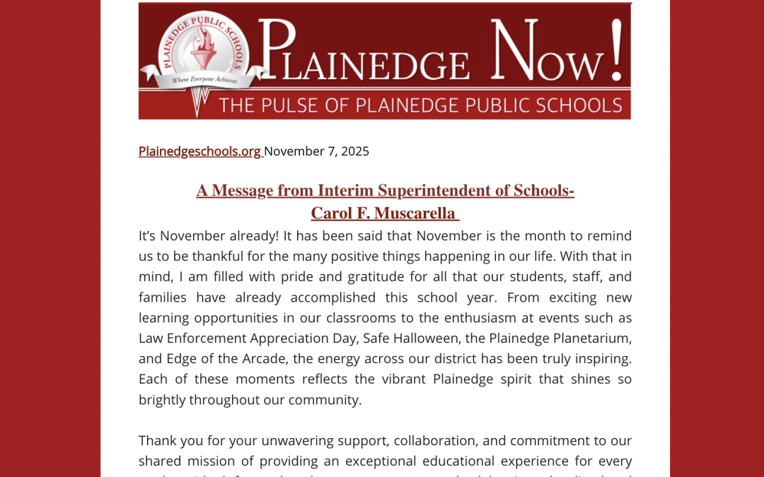 The Board of Education is pleased to welcome Mrs. Carol Muscarella as Interim Superintendent of Plainedge Schools. As many of you know, Mrs. Muscarella is a deeply respected leader with a long history of service to the Plainedge School District. Her deep love for its students, faculty, staff, and community is why she answered the call to serve once again. We are confident that her experience and dedicated leadership will provide stability and guidance during this transitional period.